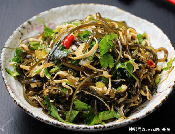 最後將海帶絲、豆腐皮、香菜放在一起,倒入料汁攪拌均勻即可。