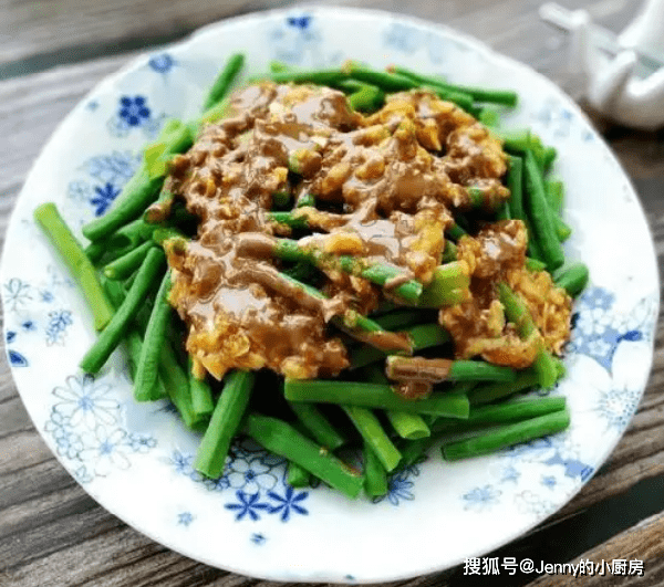 最後將調稀的芝麻醬澆在豇豆上,再撒些蒜末,這道菜就做好瞭。吃的時候記得拌均勻。