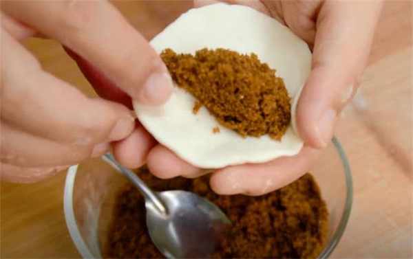 2.然後把每個劑子都揉勻,搟成一張餅皮,舀一勺紅糖餡,按照包包子的手法封口。