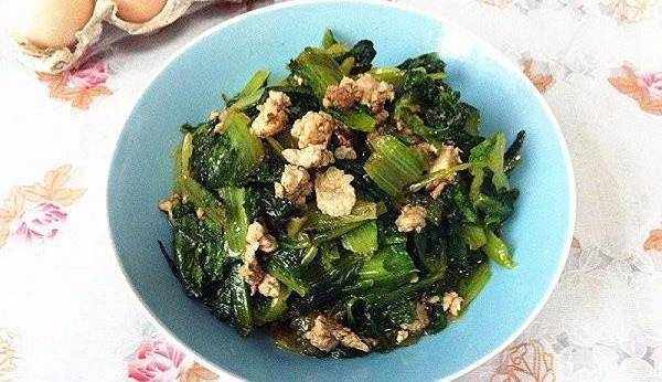 油麥菜炒肉末:油麥菜也算是食用萵筍葉,色澤淡綠、質地脆嫩,口感極為鮮嫩、清香、具有獨特風味,營養價值很高。有降低膽固醇,清燥潤肺,化痰止咳使用。加少許肉末炒食,也是不錯的味道!
