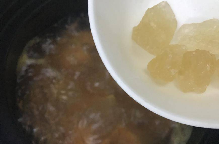 5、加入適量黃冰糖,再繼續蓋上鍋蓋,轉小火煲煮15分鐘,紅薯變軟糯即可。