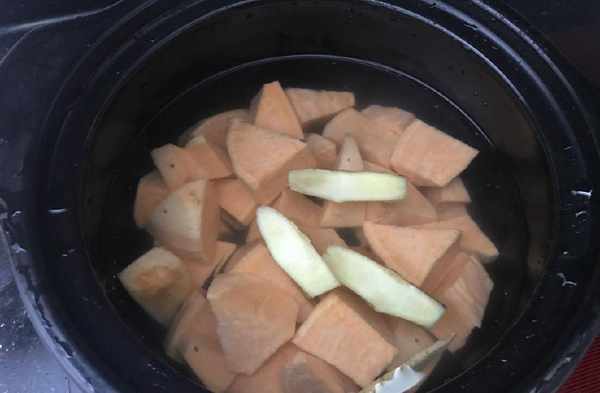 3、把紅薯、薑片一同放入砂鍋中,加入適量清水。