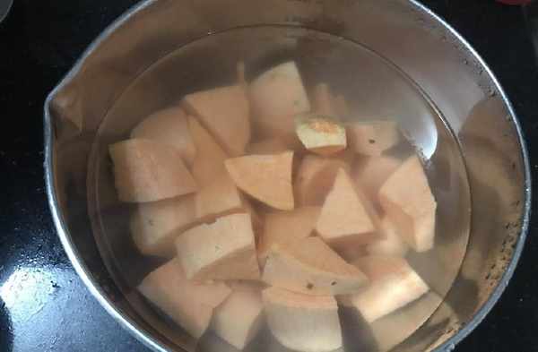 制作過程:1、將紅心番薯去皮,切成小塊,放入水中浸泡20分鐘,期間多次換水,泡至水變清澈。這樣煮出來的湯水清澈好喝,而且會更清甜哦。