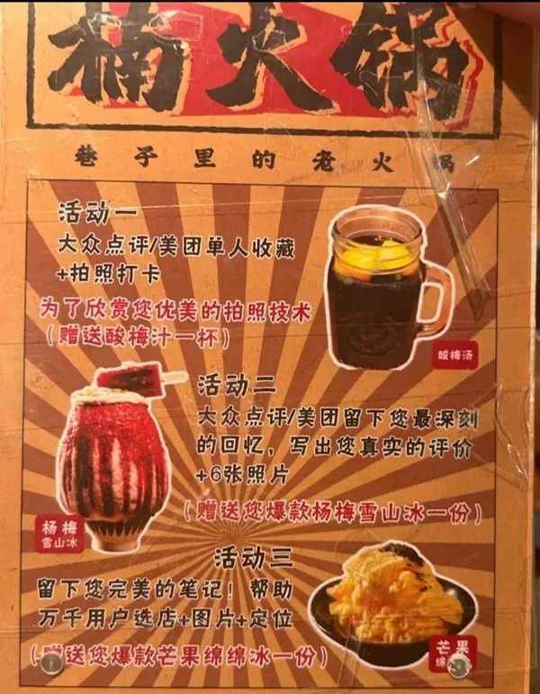 楠火鍋也推出過拍照打卡贈送甜品的活動,在大眾點評或美團上發6張照片可以獲贈標價38元的雪山冰,還特別強調瞭“寫出您真實的評價”。在其店傢頁面,現在還可以看到收藏打卡送甜品的活動,不過現在需要大眾點評的VIP7級以上才能送一份綿綿冰。