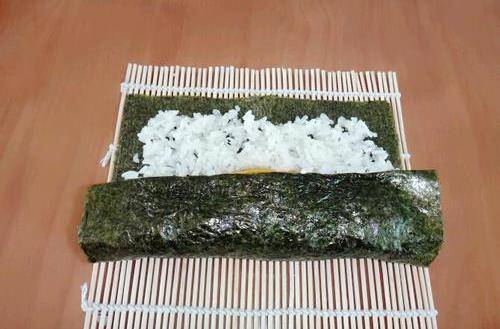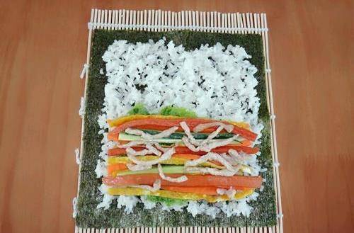 步驟一切準備就緒,開始包,拿出一張紫菜鋪好,米飯倒在紫菜上,用手弄散鋪滿紫菜的四分之三的每個角落,不要太用力把米飯壓得太扁。然後按順序放上生菜、黃瓜條、雞蛋條、胡蘿卜條、火腿腸條、牛肉絲即可。