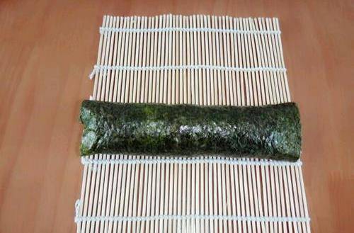 步驟把紫菜卷起來,一定要卷緊,這是最重要的,如果卷不緊的話,切的時候就會松散開來。