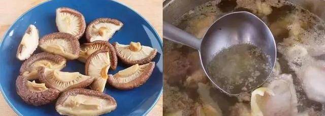 2.泡好的香菇切片。鍋中加水,放入雞塊,大火燒開後撇去浮沫關火,將雞塊控水撈出。