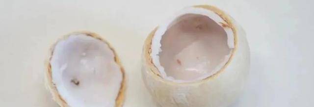 2.椰子開口,倒出椰子汁,從1/4處用刀切開,取出果肉切條。