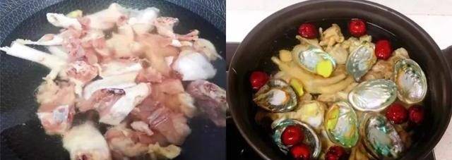 2.雞肉砍小塊後,冷水下鍋焯水,煮開後,撈出浮沫,清洗幹凈。把雞肉、鮑魚的殼、紅棗、薑,放入砂鍋中。