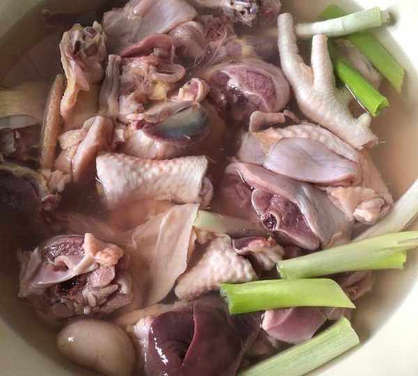 第2步、涼水涼鍋下雞肉,放點蔥段,放料酒(放薑片)開火。開鍋後再煮個2-3分鐘。