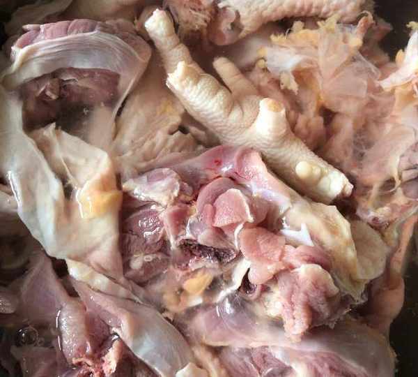 第3步、同時,高壓鍋裡放水開煮。水開後把雞肉撈過來(如果血沫多的話,就開著火在鍋裡輕輕的晃掉)。