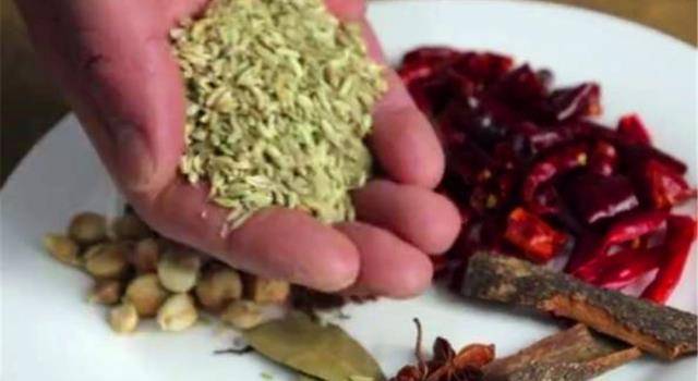 第二步:制作調料包。將茴香、八角、桂皮、花椒、幹辣椒、白芷、陳皮、香葉一起放在一個調料包裡用繩子封口,然後將做好的調料包過一遍涼水。