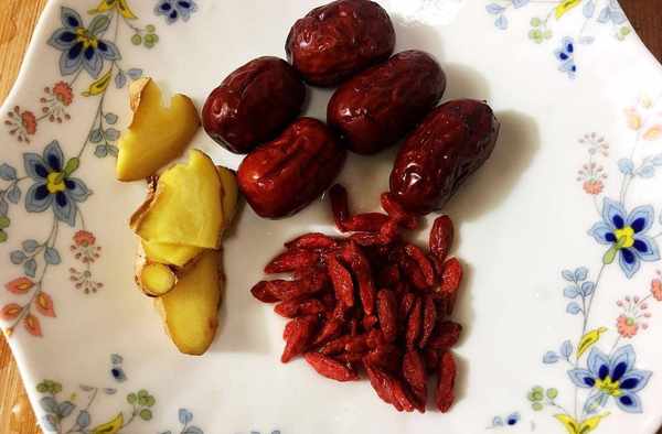 1.把薑洗幹凈後,切幾片備用,紅棗和枸杞也洗幹凈備用。