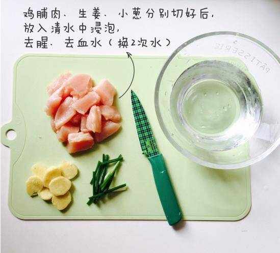 第一步:雞脯肉切成塊,生薑,小蔥分別切好後 放入清水中浸泡。 去腥,去血水 換2次水