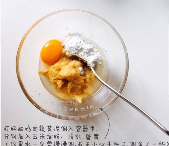 第四步:把打好的雞肉蔬菜倒入碗裡 加入蛋黃 加入玉米淀粉 加一小杯清水 (水不要倒太多呦 往一個方向攪拌開)