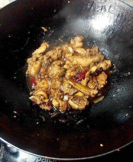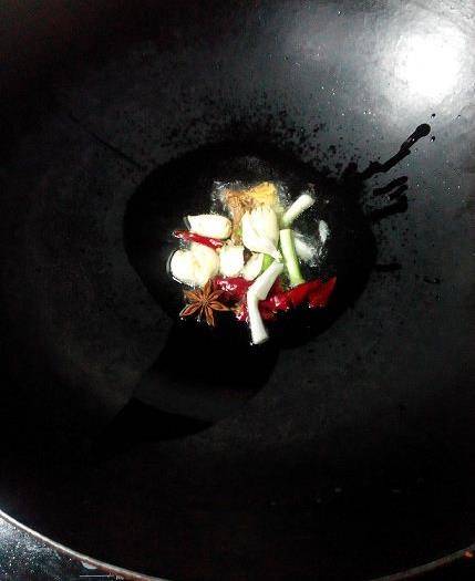 鍋裡熱油,油不要多,鴨皮很出油;把蔥薑蒜,幹辣椒,八角放下去炒香。