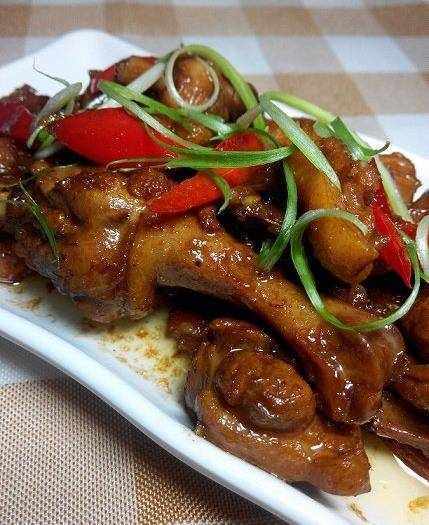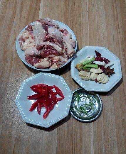 鴨子清理幹凈後洗凈剁成塊;甜椒洗凈切菱形;小蔥去根洗凈取一部分切蔥絲;大蒜拍破去皮,老薑拍扁,剩下的小蔥切蔥段,幹辣椒對半撕開,與八角放在一起,方便一同下鍋。