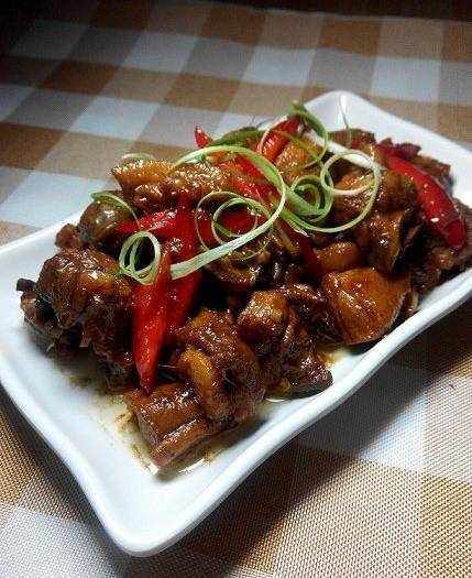 鴨肉熟後,改大火收汁,汁要收得濃濃的,甜椒倒進去,翻炒均勻就可以關火瞭。