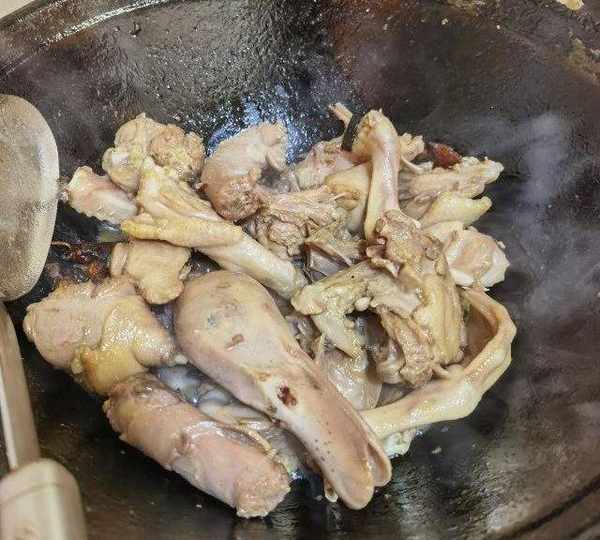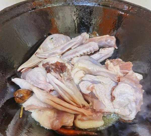 第5步、下入鴨肉塊煸炒。