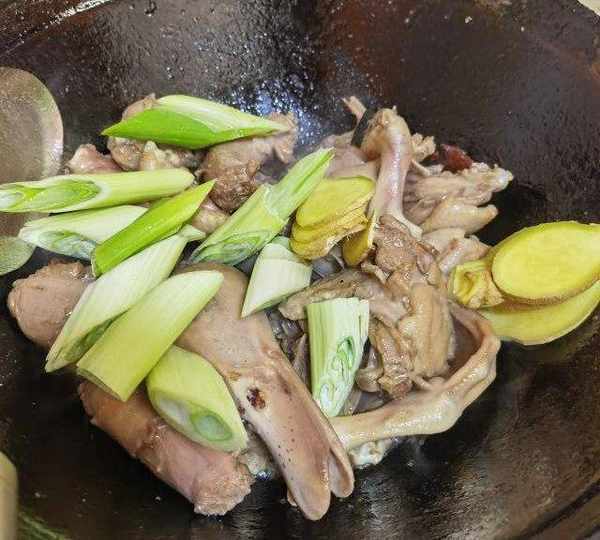 第7步、加入薑片和蔥段翻炒幾下。