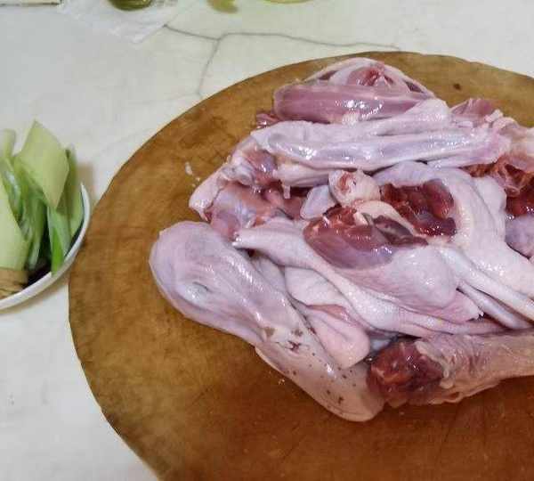第2步、麻鴨改刀成塊,蔥切斷,薑切片。