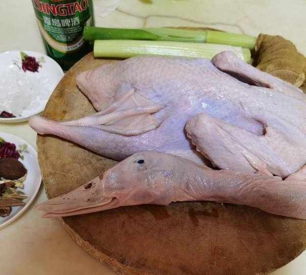 原料:麻鴨、啤酒、冰糖、燉肉料、食鹽、白酒、老抽、生抽、蔥、薑。