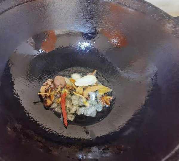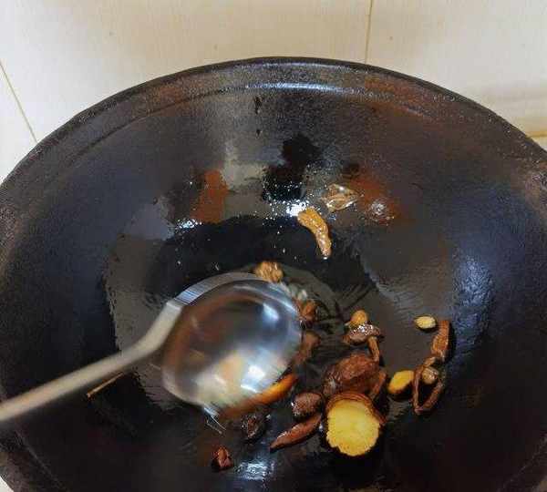 第3步、熱鍋冷油下冰糖和燉肉料,小火滑炒。