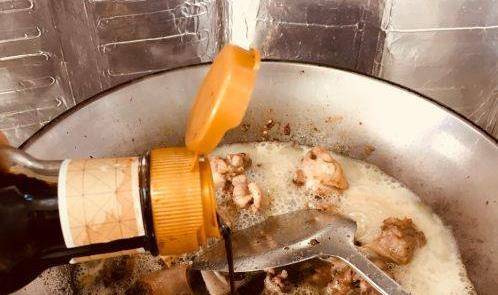 鴨肉炒出香味後,倒入啤酒