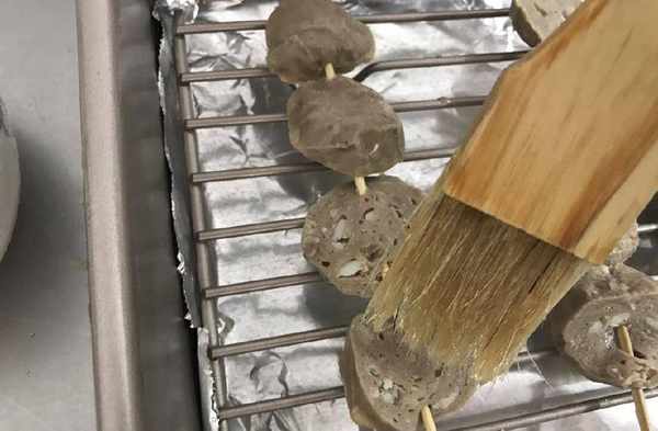 6、將丸子取出,牛肉丸兩面都刷上醬料,芝士丸可刷可不刷。繼續放入烤箱再烤8分鐘即可。