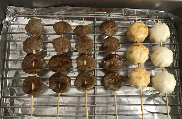 今天周末,一直下雨,跟老公宅在傢,他玩遊戲我追劇,偶爾這樣過也不錯。這貨玩一半突然說想吃烤串,讓我叫外賣。叫什麼外賣嘛,反正我也閑著沒事,決定自己動手烤一些。打開冰箱發現就剩下一些丸子,隻能試試烤丸子啦。本來還怕不好吃,剛開始隻敢烤幾串,出爐時老公一嘗,直呼太好吃啦,讓我多烤幾盤。
