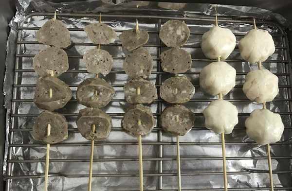 2、牛肉丸切成薄片,插入竹簽中。芝士丸因為有內餡,直接插入竹簽。