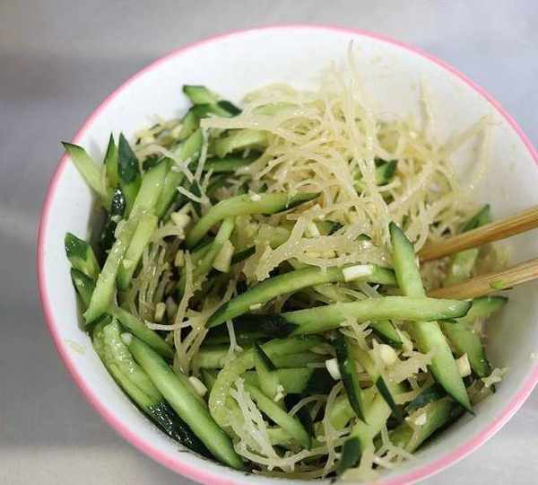 第5步、黃瓜切細絲,大蒜拍扁剁碎,同入碗中,加適量鹽、生抽、醋同拌。