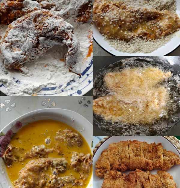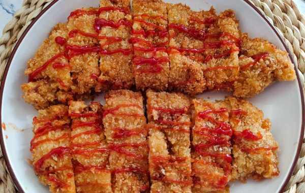 2、雞胸裹上一層幹淀粉,裹上一層雞蛋液,滾上一層面包糠,抖落掉多餘的面包糠。油鍋六成熱,放進去炸到兩面焦黃酥脆,撈出控油。