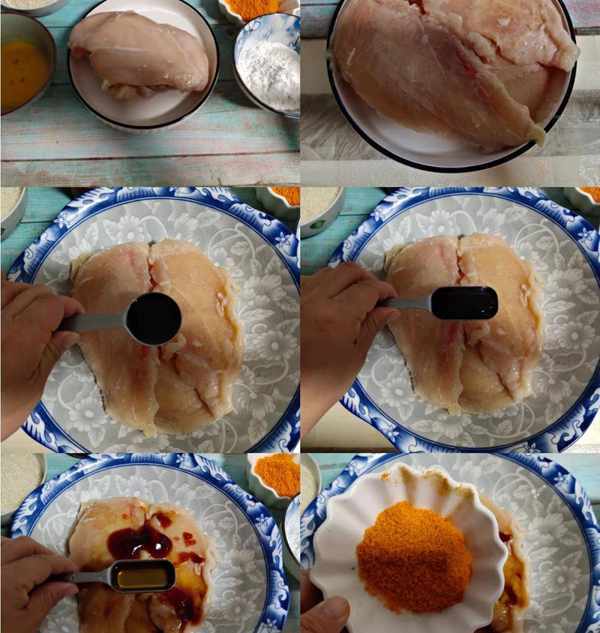 準備原料:雞胸兩塊,生抽兩勺,蠔油兩勺,料酒一勺,奧爾良醃料兩勺,淀粉100克,雞蛋兩個,面包糠適量;