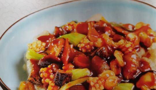克。調料A料(芝麻醬20克,清水10克,白醋、蒜末各5克,鹽、味精各2克,調勻),B料(芝麻醬20克,蠔油、宮匠坊頭道鮮醬油各7克,白糖、味精各5克,老抽3克),色拉油20克,骨湯200克,蒜蓉、蔥花各5克,薑片3克。制作1燜子切丁,入煎鍋煎至金黃、脆嫩裝盤,澆入A料。2.魷魚花、蝦仁、海參焯沸水撈出。3.起鍋倒入色拉油,放入蔥、薑、蒜爆鍋,放入B料,添入骨湯燒開,加入魷魚花、蝦仁、海參,淋濕淀粉勾芡,淋入明鍋澆在燜子上面即可。
