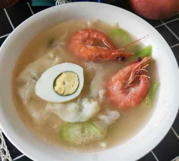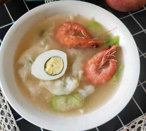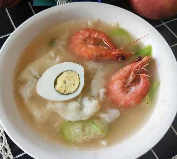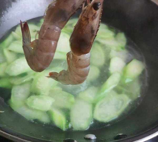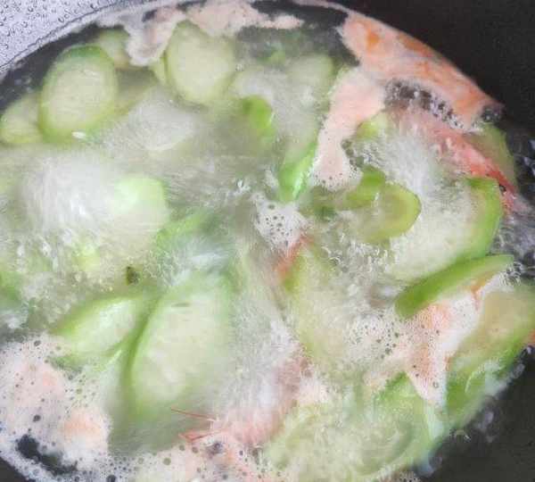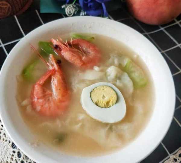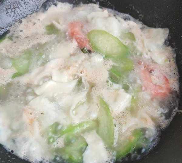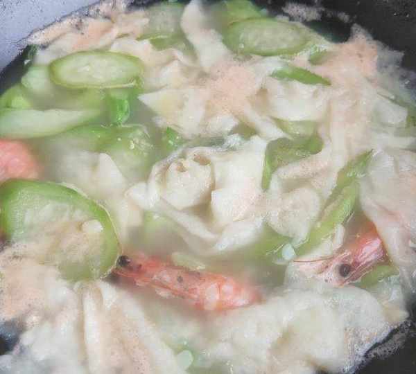 原料:面團、青蝦、絲瓜、雞蛋、鹽、蔥花、雞精、食用油。