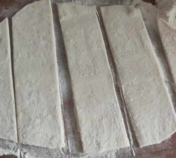 第14步、取一條面片,用手輕輕地抻開,越薄越好,依次將面片放進去。