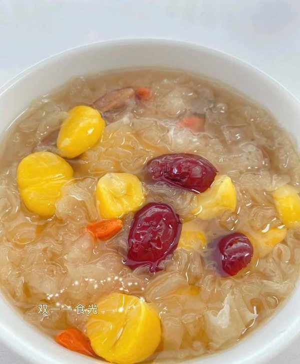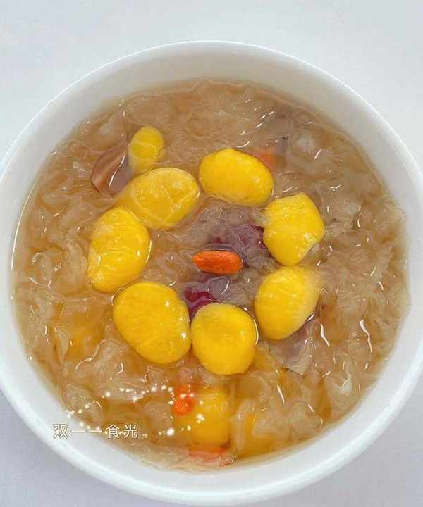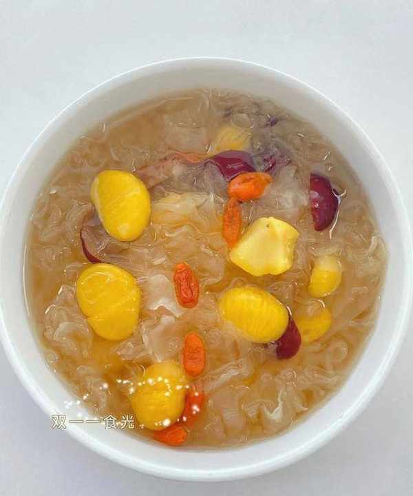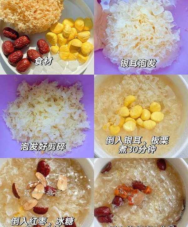 3、鍋中倒入兩碗清水,放入銀耳碎和板栗仁,煮30分鐘左右,再放入紅棗和冰糖,煮10分鐘左右,倒入枸杞再煮5分鐘就可以瞭!