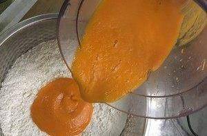 用打汁機將煮好的南瓜打成南瓜糊,酵母用一勺溫水化開,加兩勺白糖攪均勻,慢慢的倒入面粉,然後揉成團,讓面發至它的一倍大