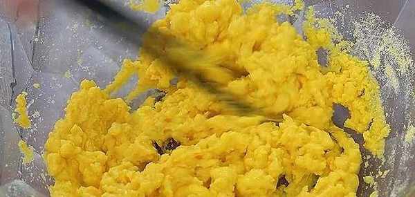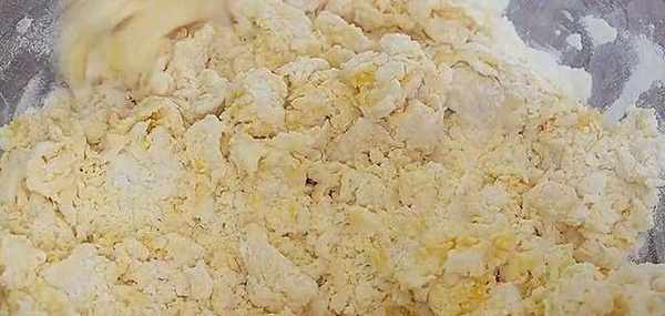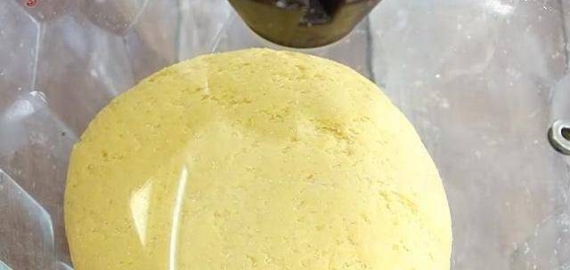 1.100克玉米面放入盆中,用100毫升開水燙一下,攪拌成顆粒狀。燙過的玉米面吃著更細膩。