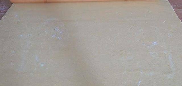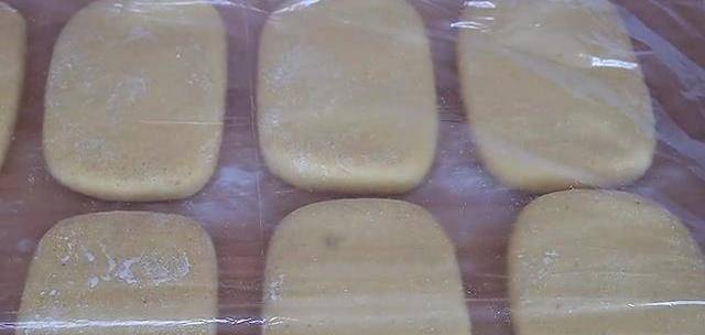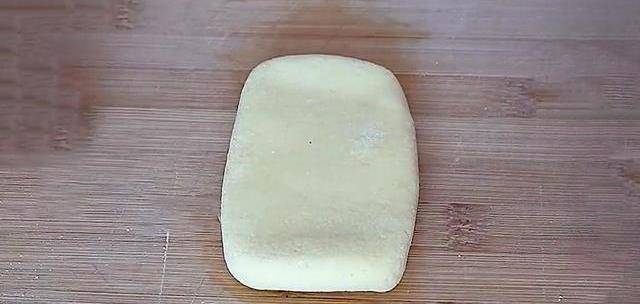 13.最後用搟面杖把它搟成長方形的面片。一個生坯就做好瞭。