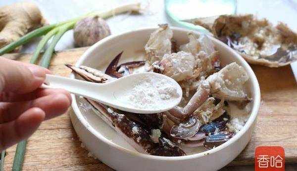 3.蟹塊用鹽、白酒醃制,再裹上淀粉。
