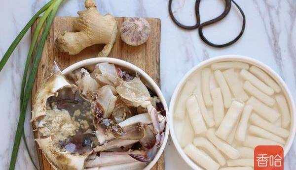 1. 梭子蟹洗凈,去掉蟹蓋、蟹腮,剁成塊,蟹鉗用刀背拍裂些。年糕用清水泡一會兒。