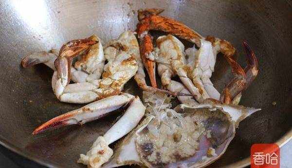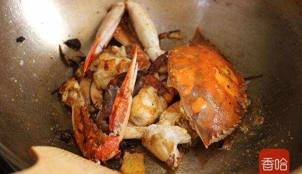 6.將蟹塊再次放入翻炒。烹入一湯匙白酒。