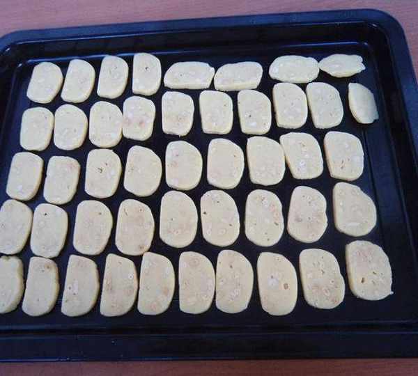 第9步、將餅幹坯放入烤盤,入烤箱中層,上下加熱,160度15分鐘左右烘培。