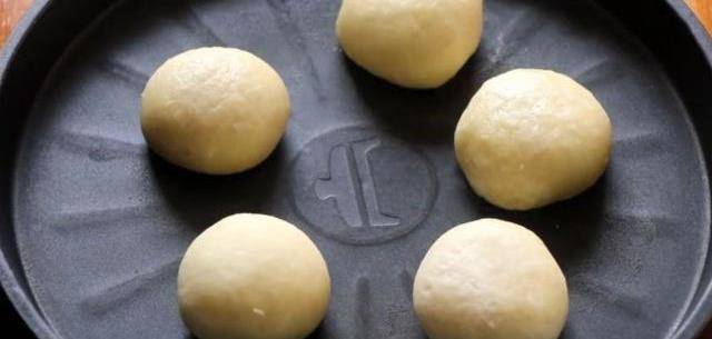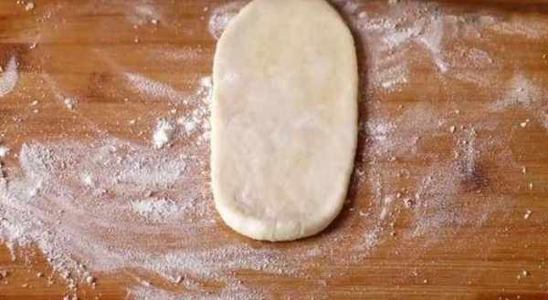 7.案板上撒適量幹面粉,將包好的丸子壓扁,用搟面杖搟成牛舌狀,從一頭往上卷起來,再次壓扁搟成牛舌狀,最後一次從一頭卷起壓扁,搟成圓形面片。