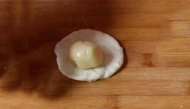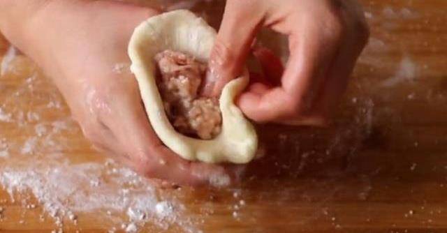 8.面片中放入適量肉餡,用虎口收緊並捏合緊實,放在案板上再整理得更加圓潤。