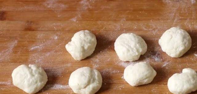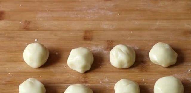 5.將油酥面取出同樣揉成長條,切分成8個面劑子,分別搓圓備用。