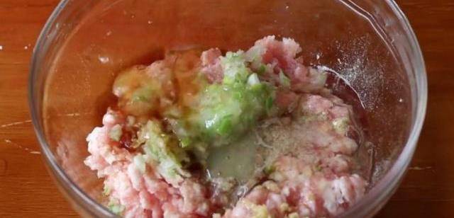 3.準備200克豬肉剁成肉餡,再將生薑和香蔥切末一起放入碗中,加半勺鹽、半勺胡椒粉、一勺生抽、10毫升食用油,最後打入一個雞蛋清,用筷子順著一個方向攪拌上勁。
