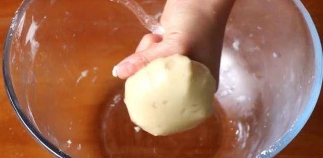 1.碗中倒入100克面粉、5克白糖、5克鹽,再準備55毫升清水攪拌至沒有幹面粉後,倒入25毫升食用油,下手輕揉幾下,不要太久以防止起筋,用保鮮膜密封好放一旁醒20分鐘,水油皮就做好瞭。